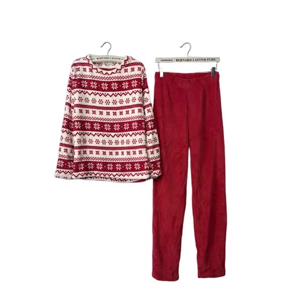 This coral fleece pajama set features a snowflake-embellished top paired with dark blue or red trousers, bringing a warm and comfortable new leisure experience to the whole family in the busy city life, allowing you to enjoy precious moments.